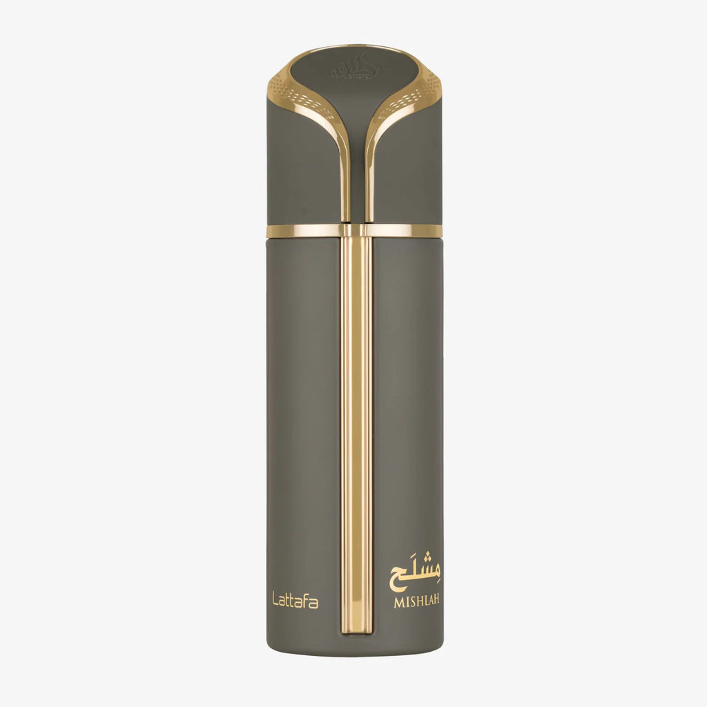 Mishlah by Lattafa se presenta en una elegante botella color carbón mate con refinados detalles dorados, envuelta en una lujosa caja inspirada en la herencia de Oriente Medio. Su diseño audaz y moderno refleja confianza, sofisticación y lujo atemporal.